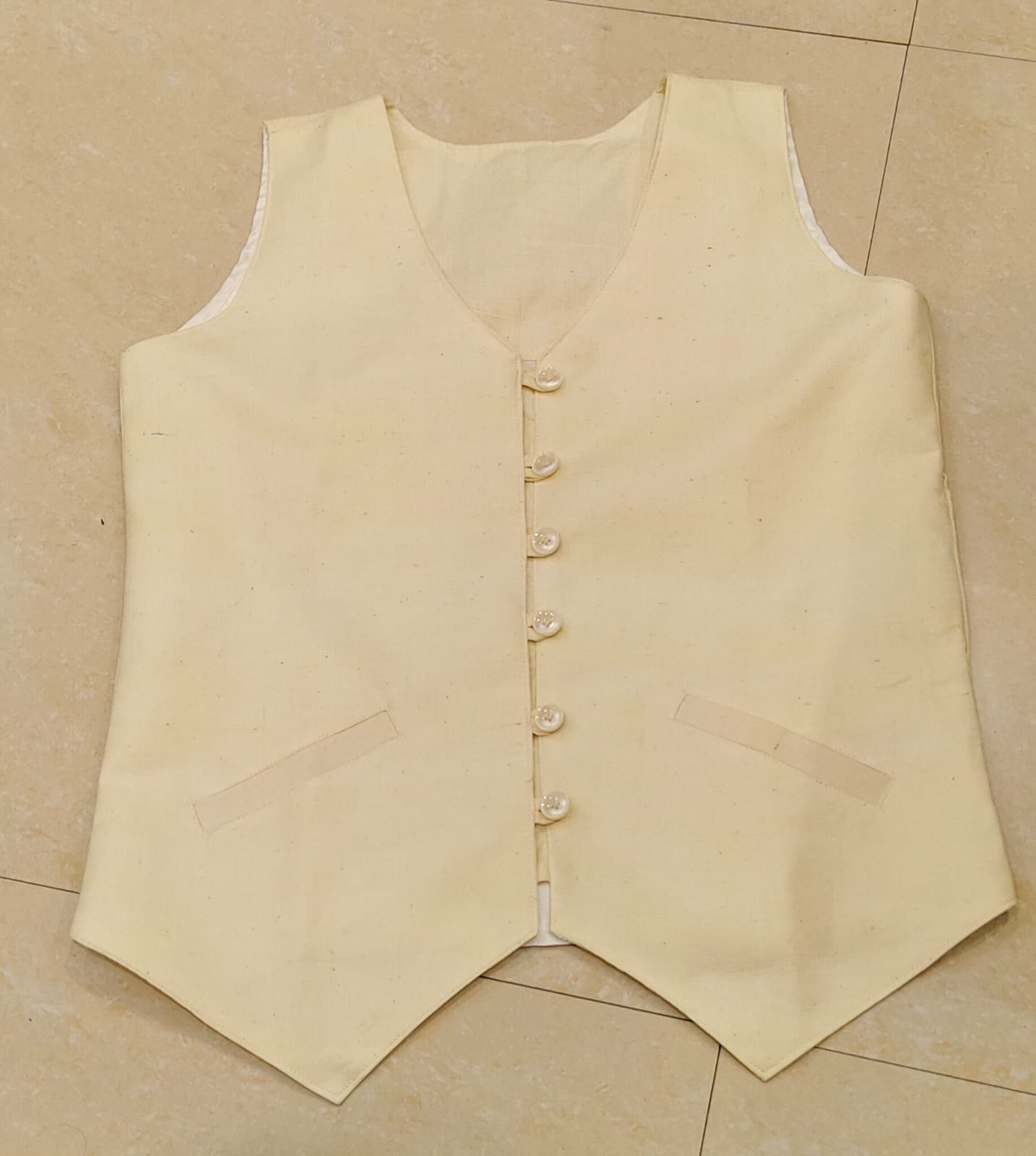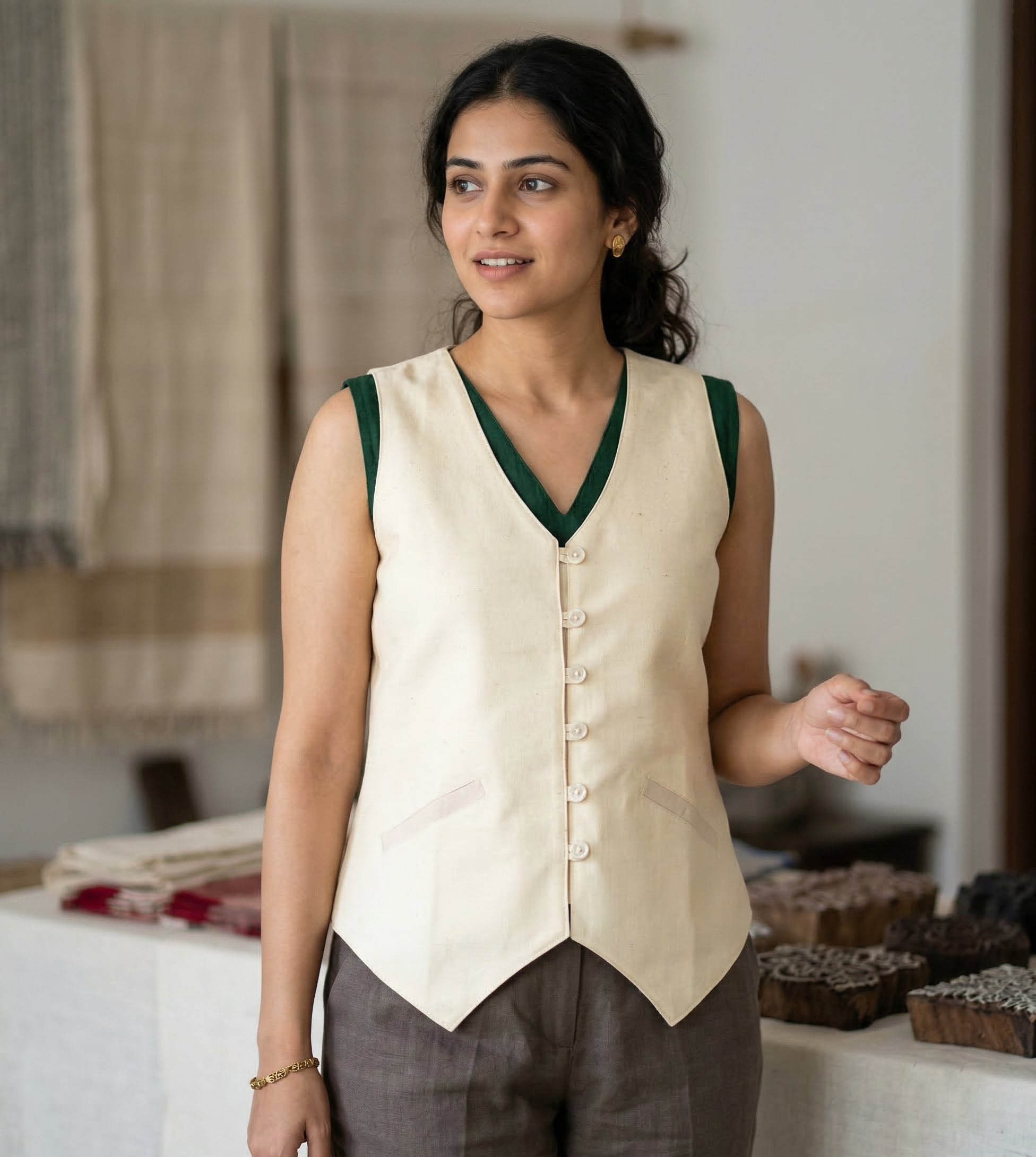 This beautiful piece of 3 button waistcoat is made from Eri silk blend which is handspun and handwoven in Guwahati, Assam. Both the sides are covered with two flap pockets along with a v neck collar, enhancing the beauty when worn on top of a kurta or skirt. To elevate the traditional/formal look, this waistcoat is a must go addition to your wardrobe.