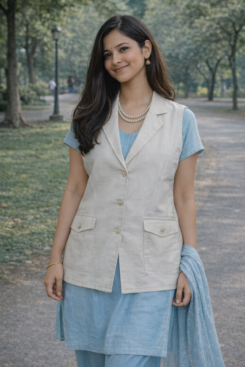 This beautiful piece of 3 button waistcoat is made from Eri silk blend which is handspun and handwoven in Guwahati, Assam. Both the sides are covered with two flap pockets along with a v neck collar, enhancing the beauty when worn on top of a kurta or skirt. To elevate the traditional/formal look, this waistcoat is a must go addition to your wardrobe.